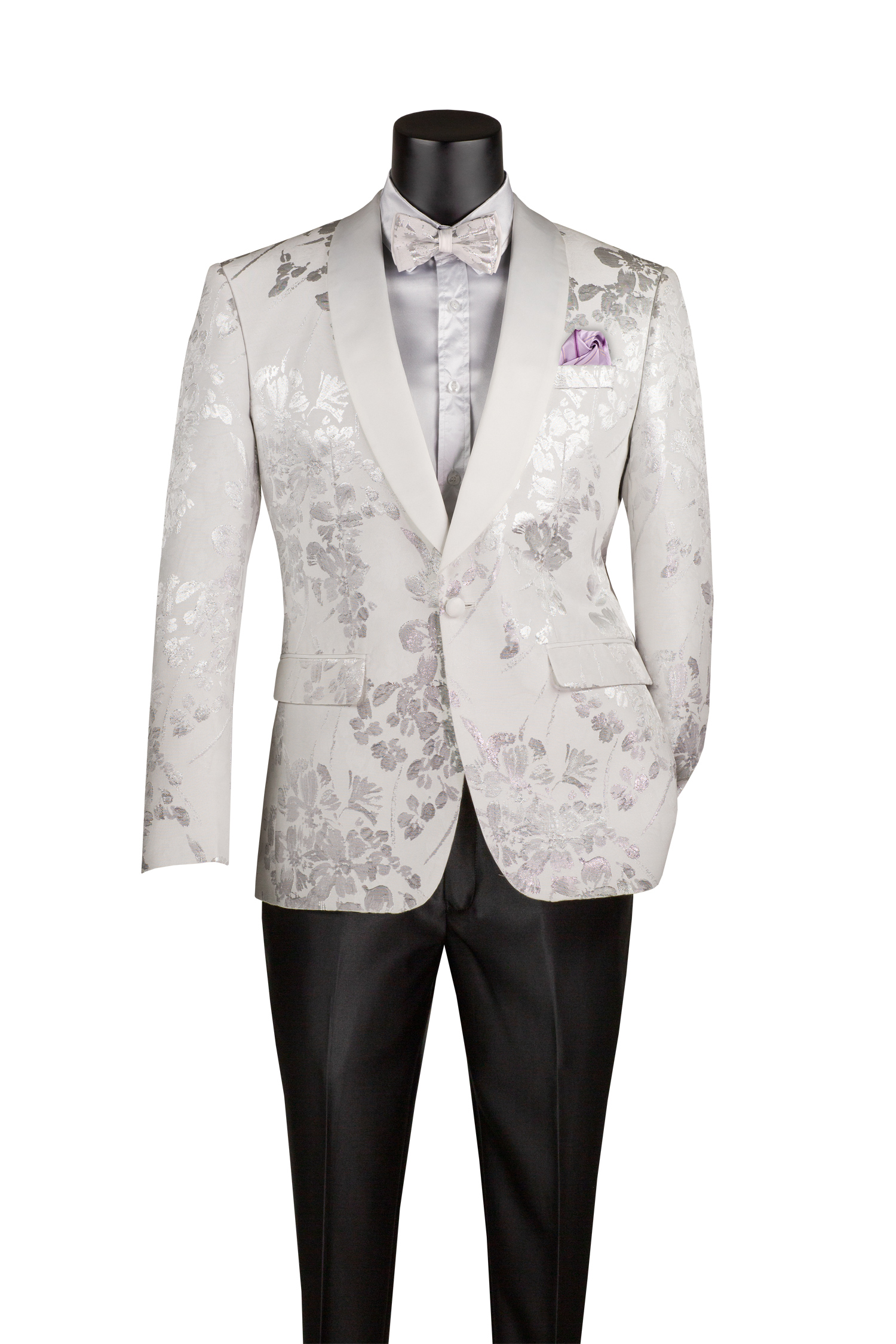 Single breasted 1 button, slim fit floral pattern jacquard fabric with matching bow tie, shawl lapel, side vents…