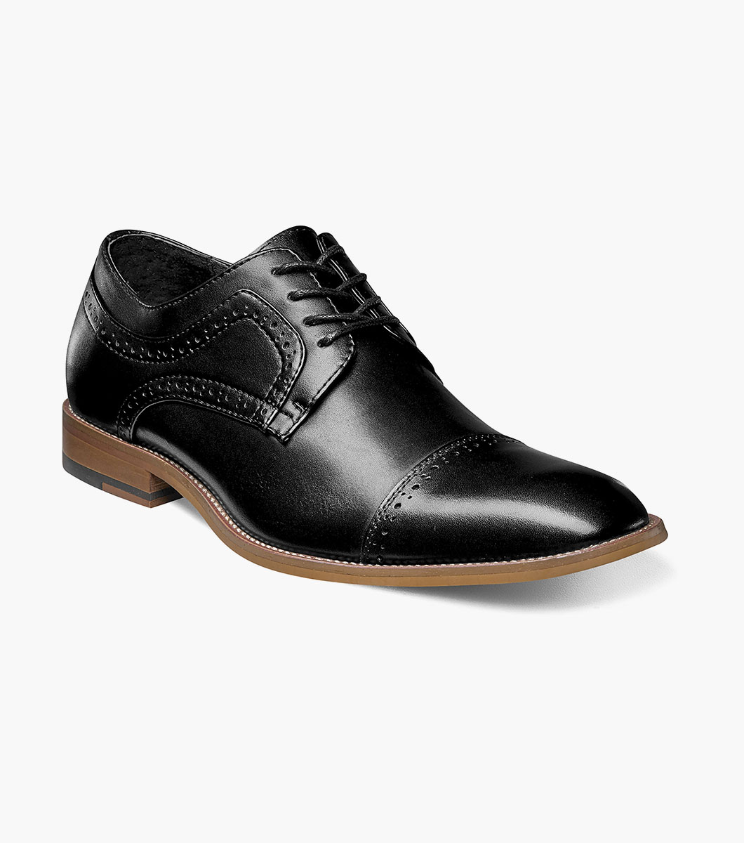 A style for every season and every reason, the Stacy Adams Maddox Cap Toe Oxford is a shoe every man should own. Sleek and elegant, the simple cap toe, perfing details, and stacked heel give it a versatile look that is easily dressed up or down.
