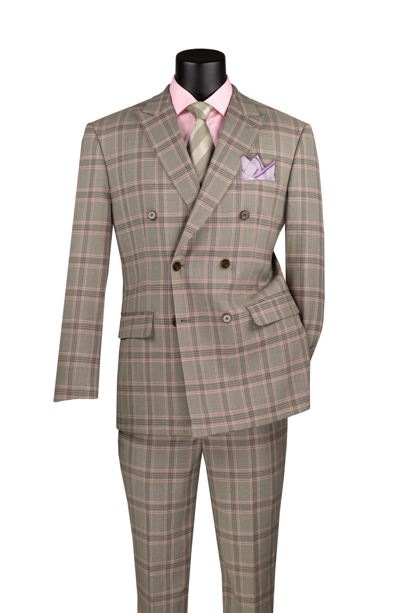 Double breasted, 6×2, side vents Flat front pants , glen plaid.