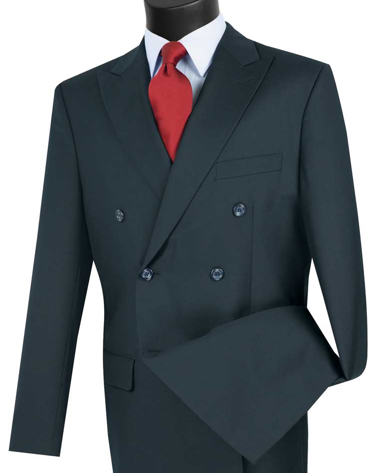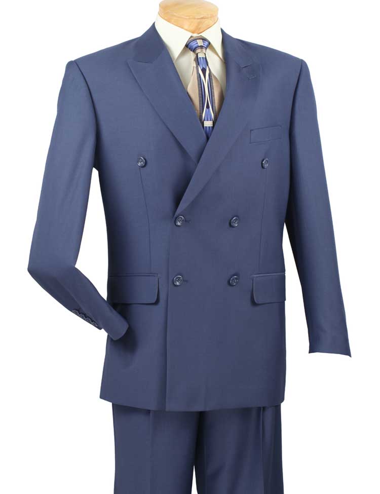 Double breasted, peak lapel, side vents, pleated pants , solid color