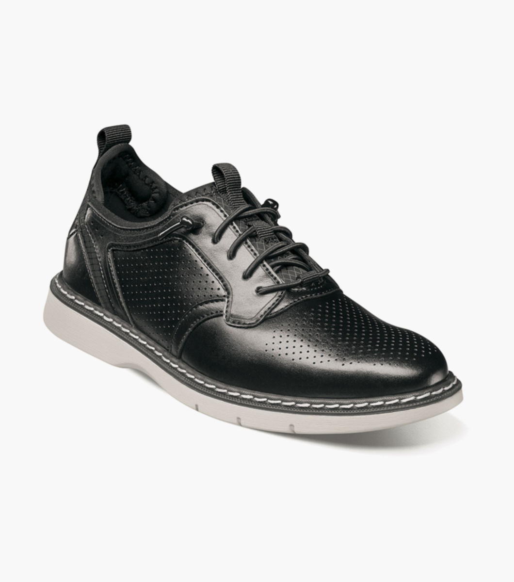 A hybrid mix of sneaker and dress shoe, the Stacy Adams Sync Plain Toe Elastic Lace Up features a rich leather upper with micro-perfing details. The elastic lace system gives it slip on convenience, while the RedZone footbed adds all-day comfort.