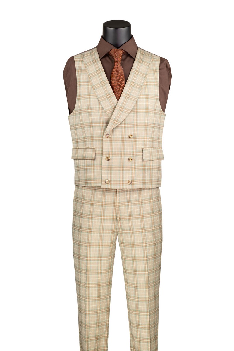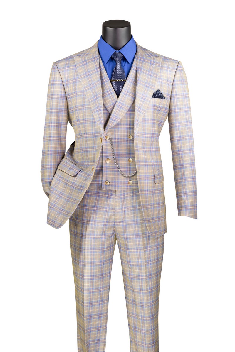 Single breasted 2 buttons, Modern fit 3 pcs notch lapel with fancy vest, Side vents, flat front pants, windowpane.