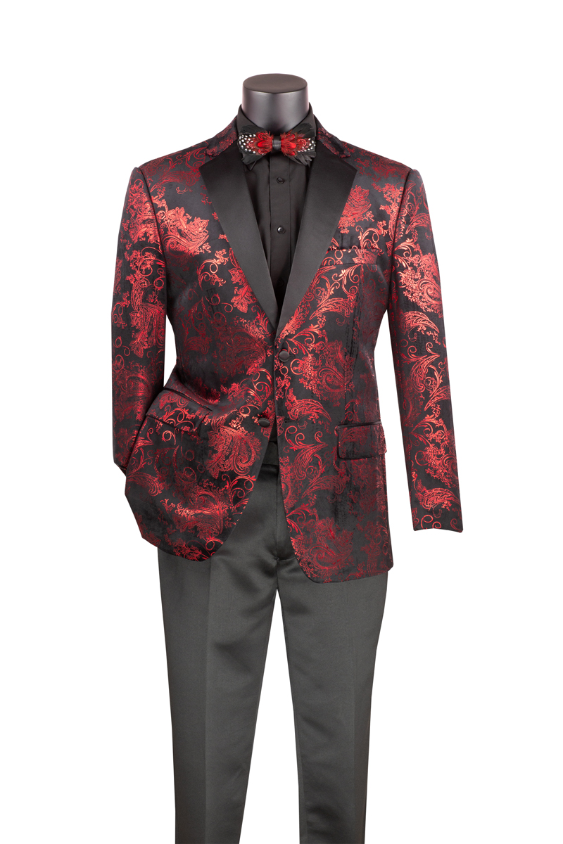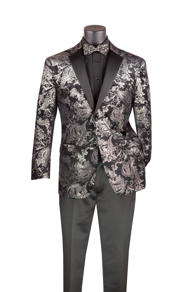 Single breasted 1 button, slim fit floral pattern jacquard fabric with matching bow tie, shawl lapel, side vents
