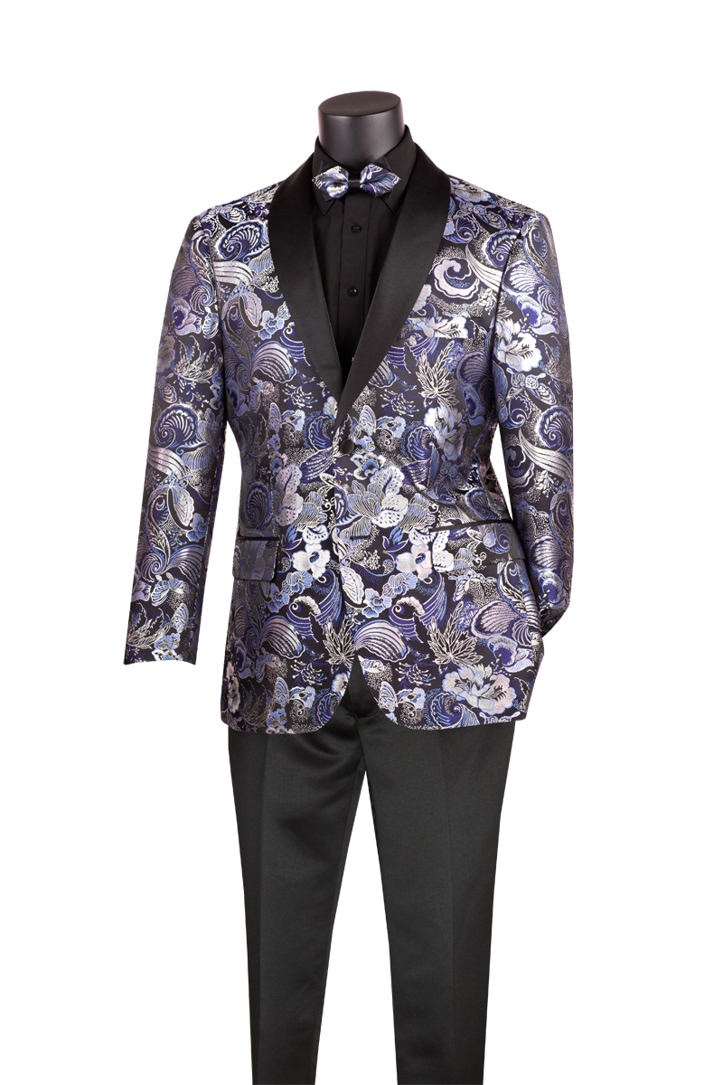 Single breasted 1 button, slim fit floral pattern jacquard fabric with matching bow tie, shawl lapel, side vents