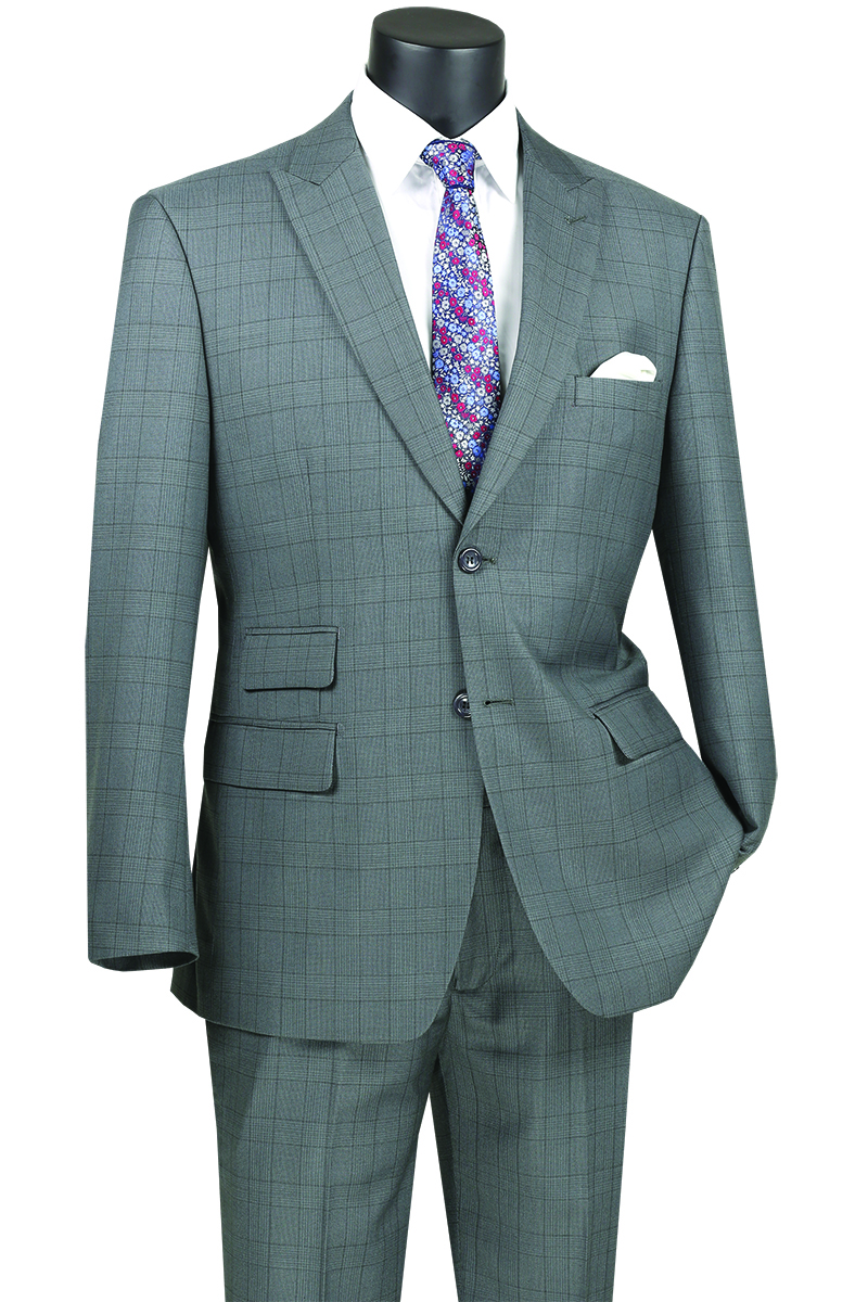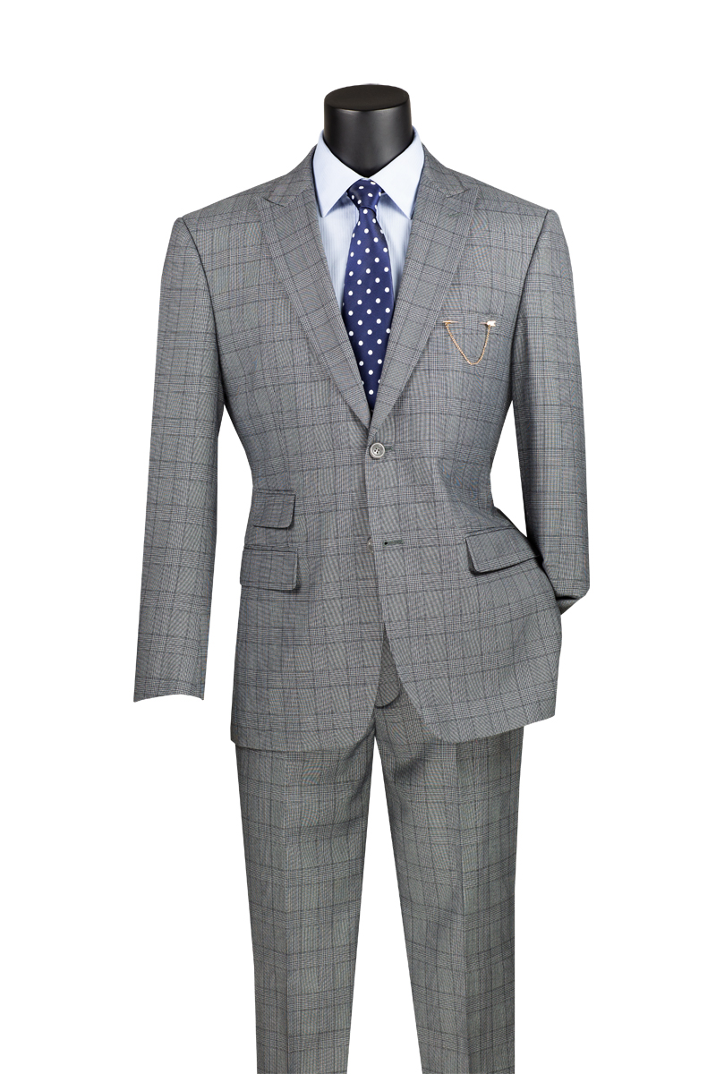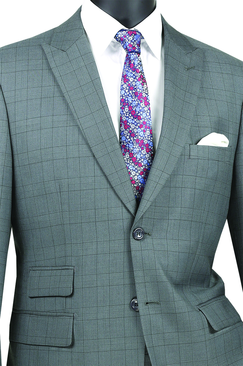 Single breasted 2 buttons, peak lapel, side vents Flat front pants, glen plaid.